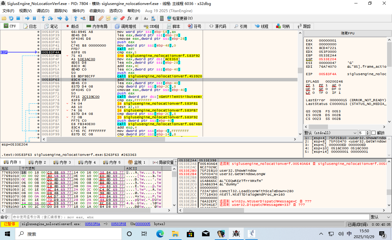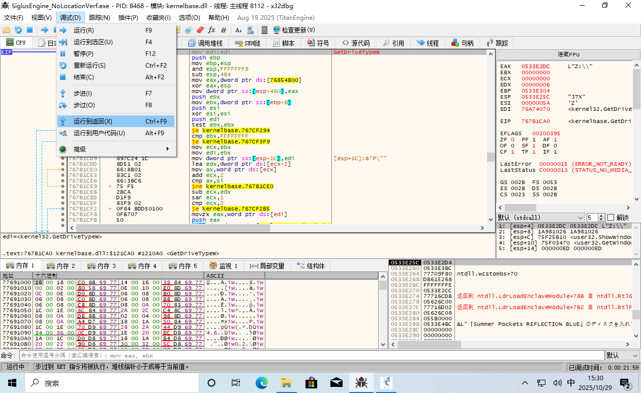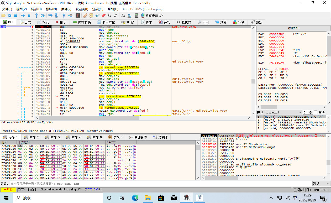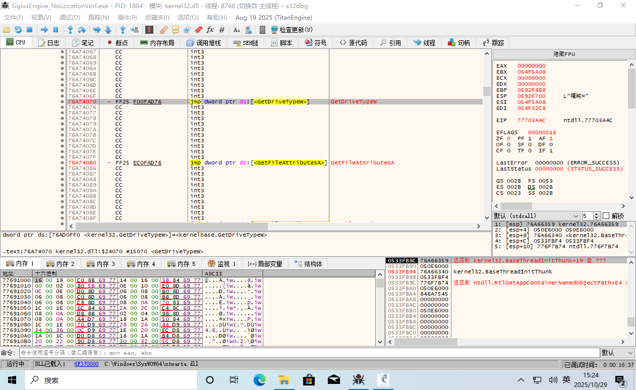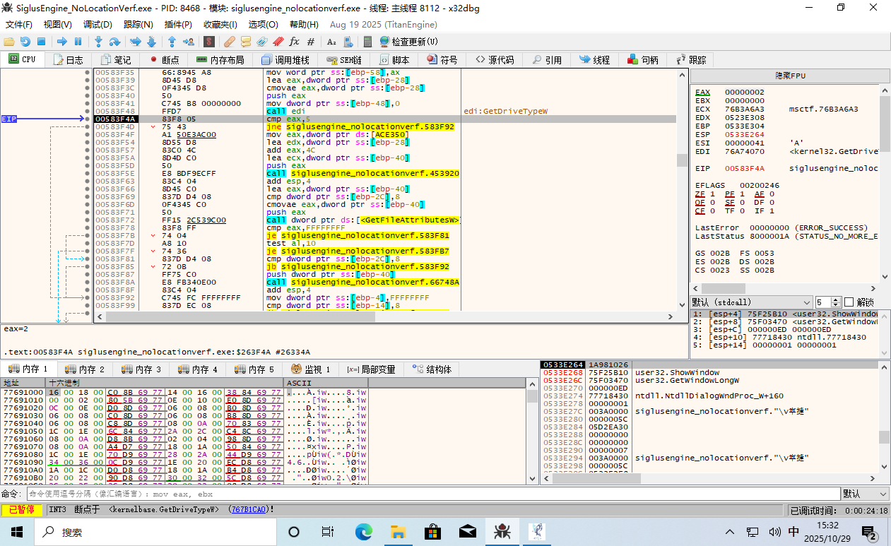 这时 EIP 返回到了游戏主程序的领空,并且上面那一条 call edi 就是呼叫了 GetDriveType。