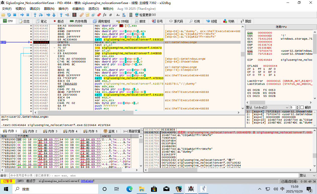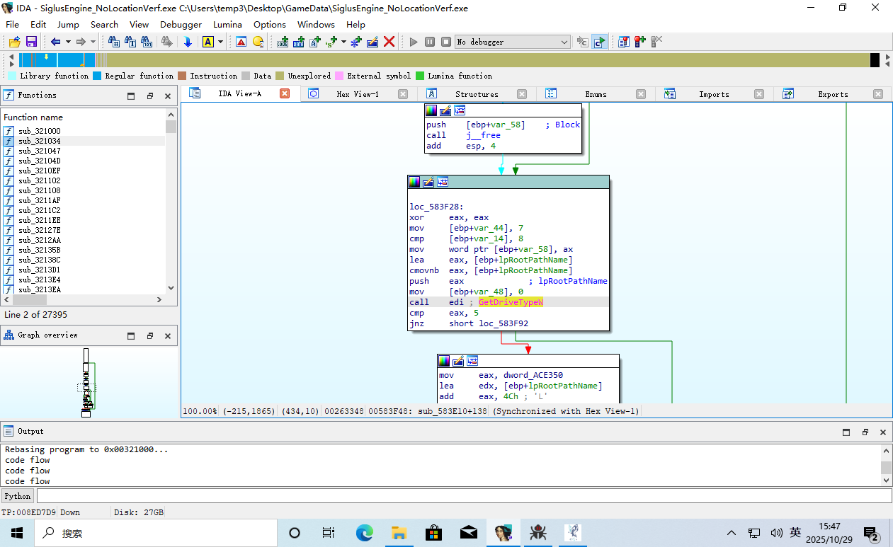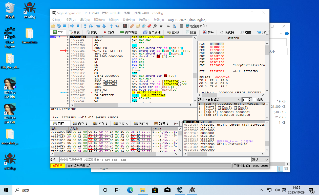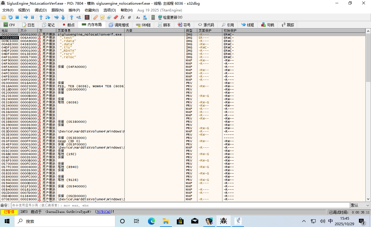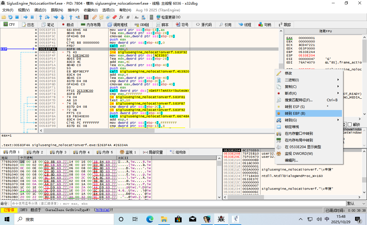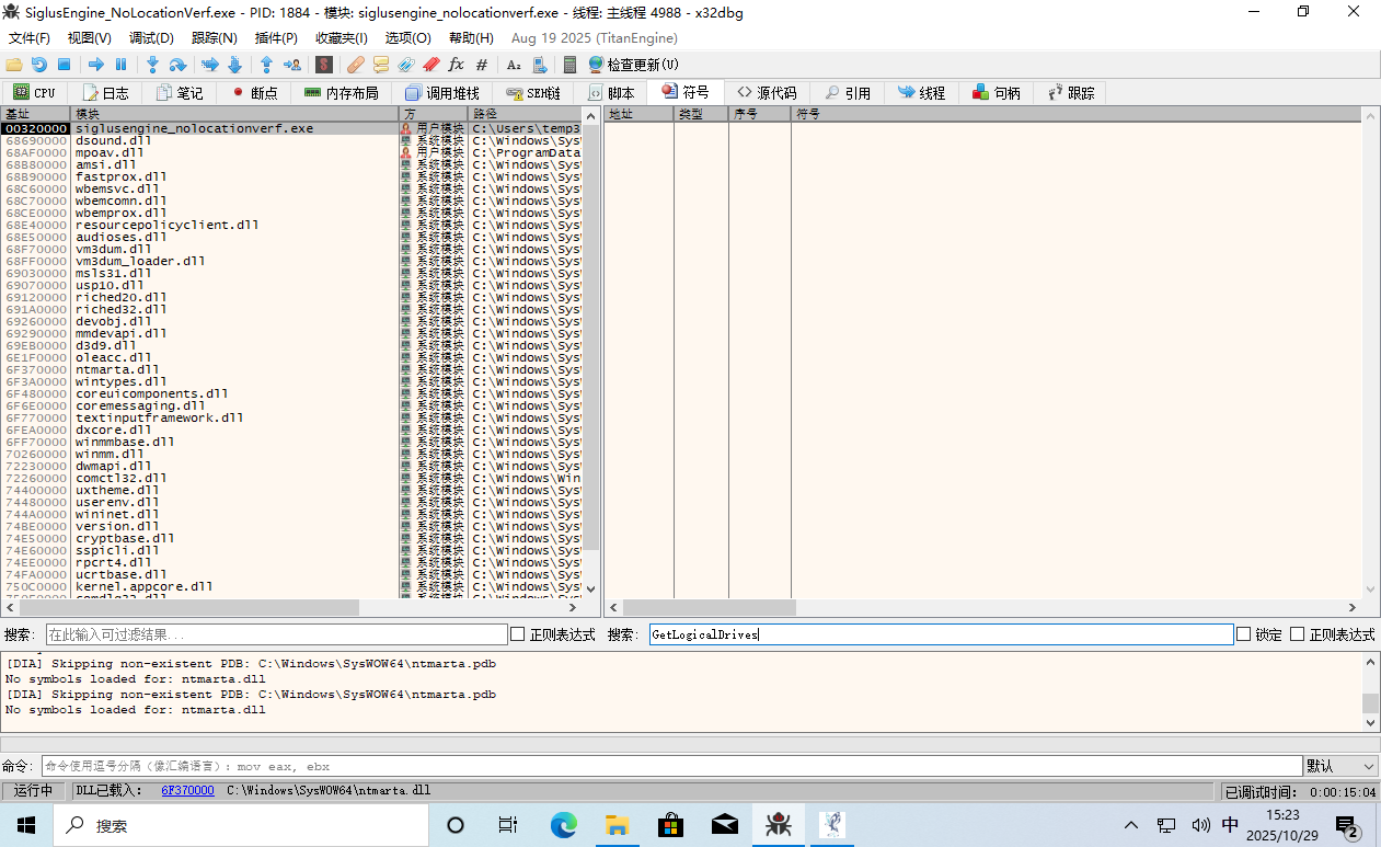 这时 EIP 返回到了游戏主程序的领空,并且上面那一条 call edi 就是呼叫了 GetDriveType。