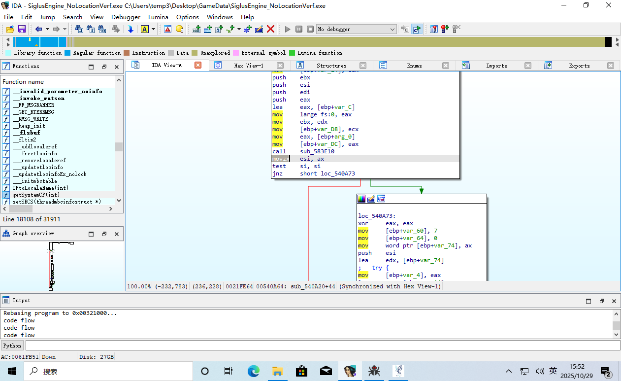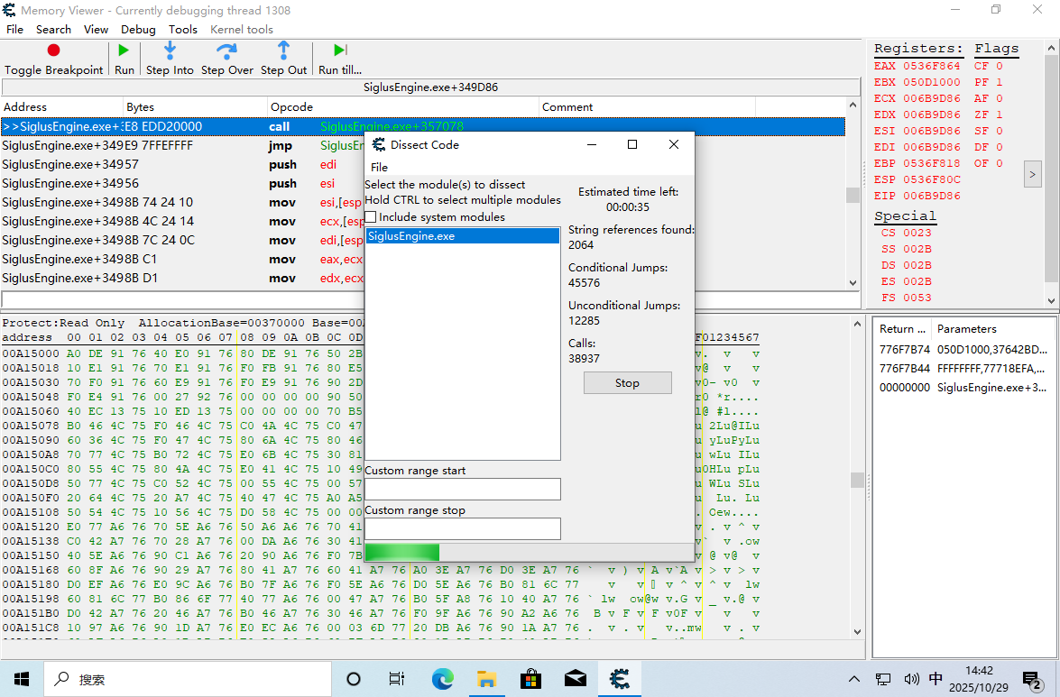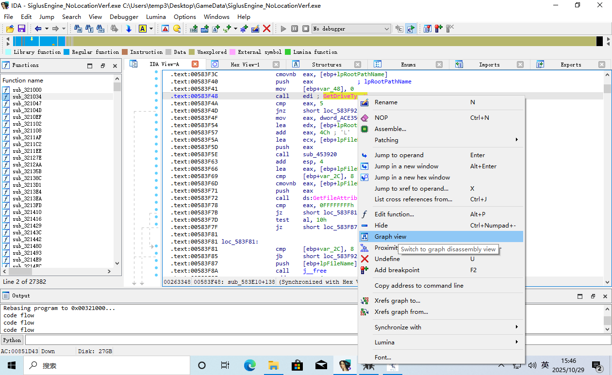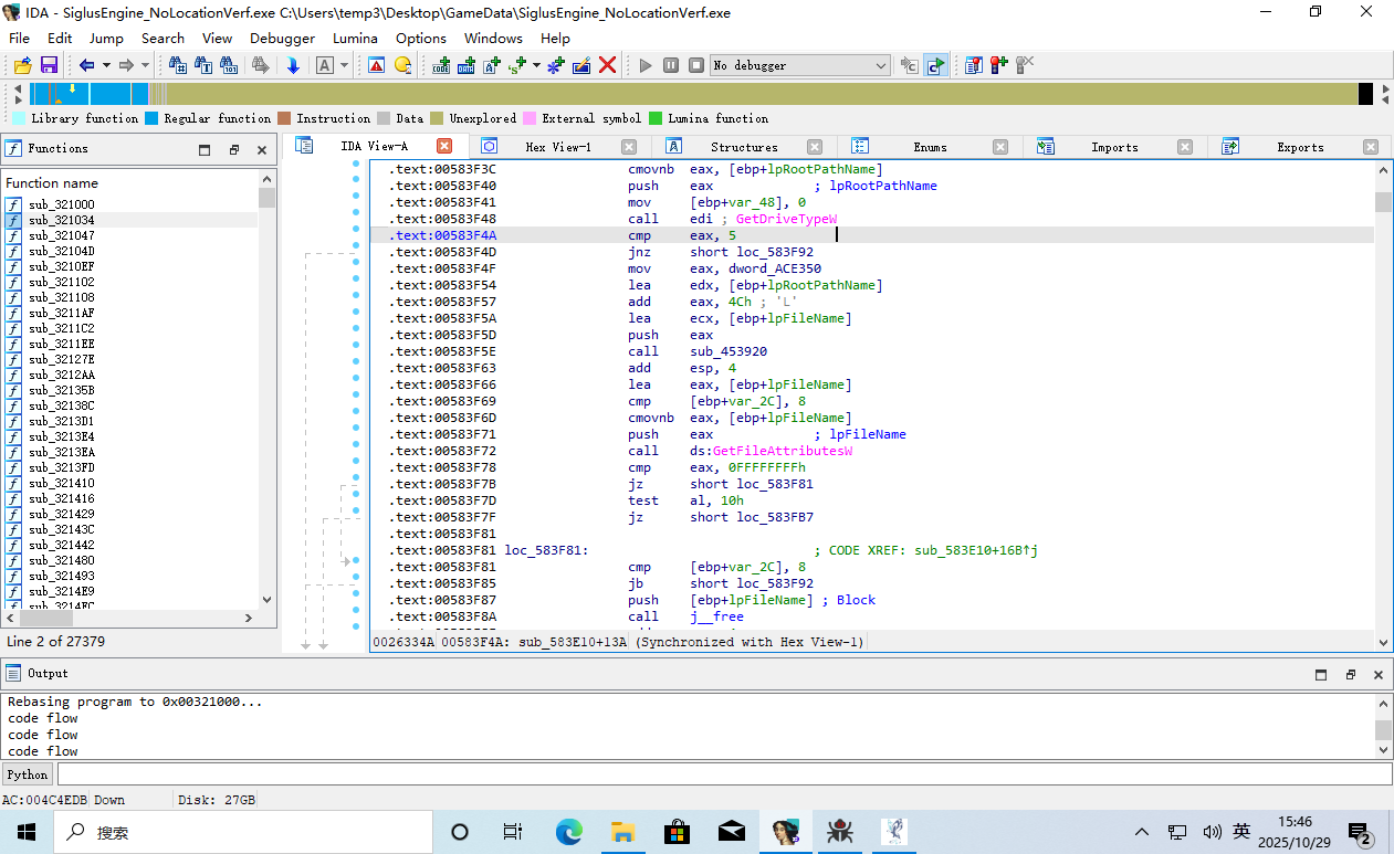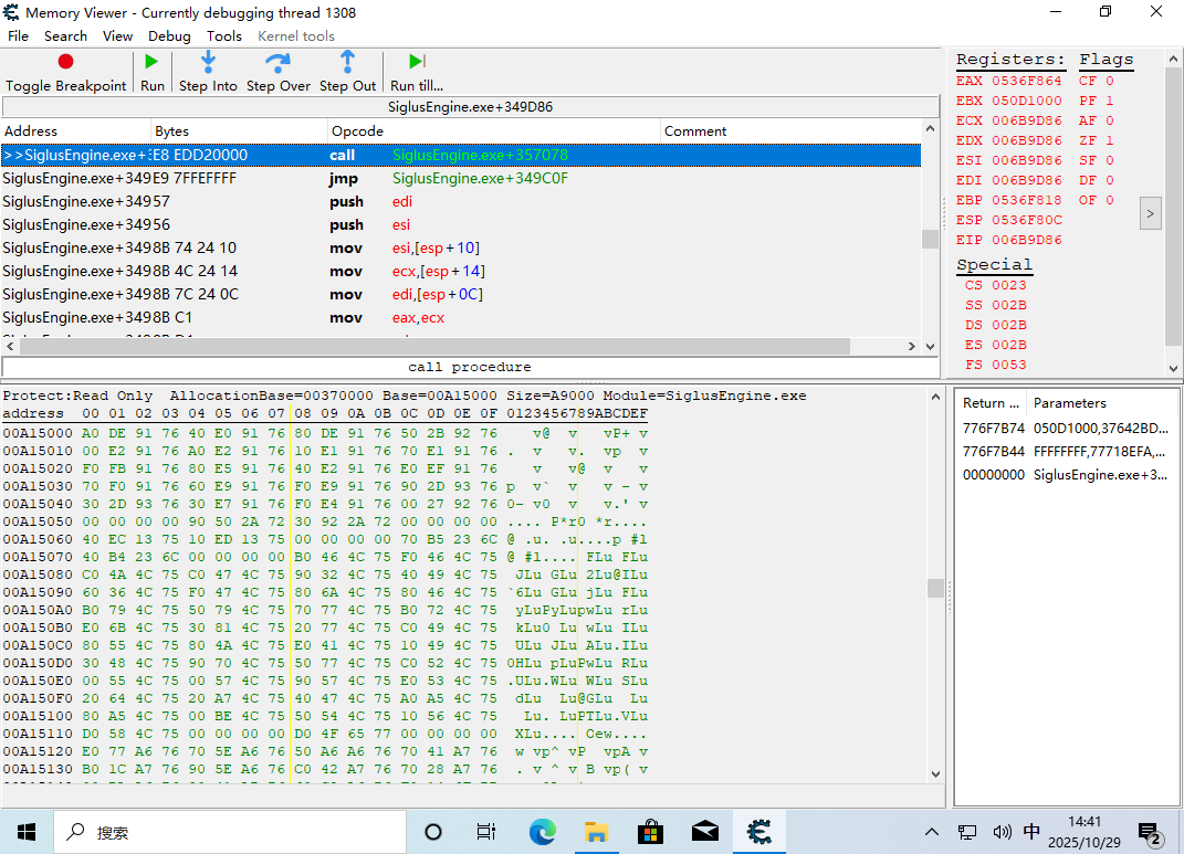 这时 EIP 返回到了游戏主程序的领空,并且上面那一条 call edi 就是呼叫了 GetDriveType。