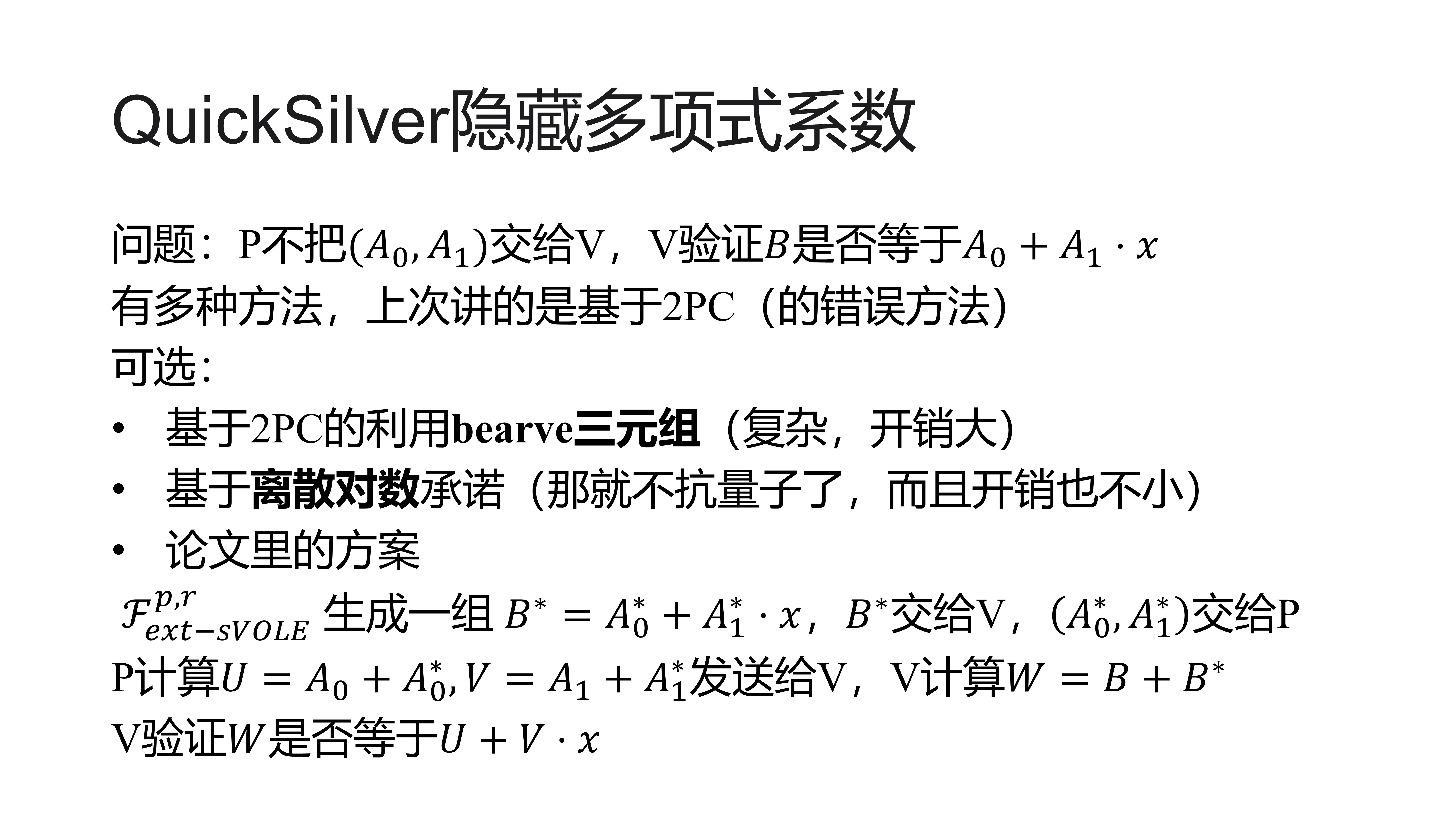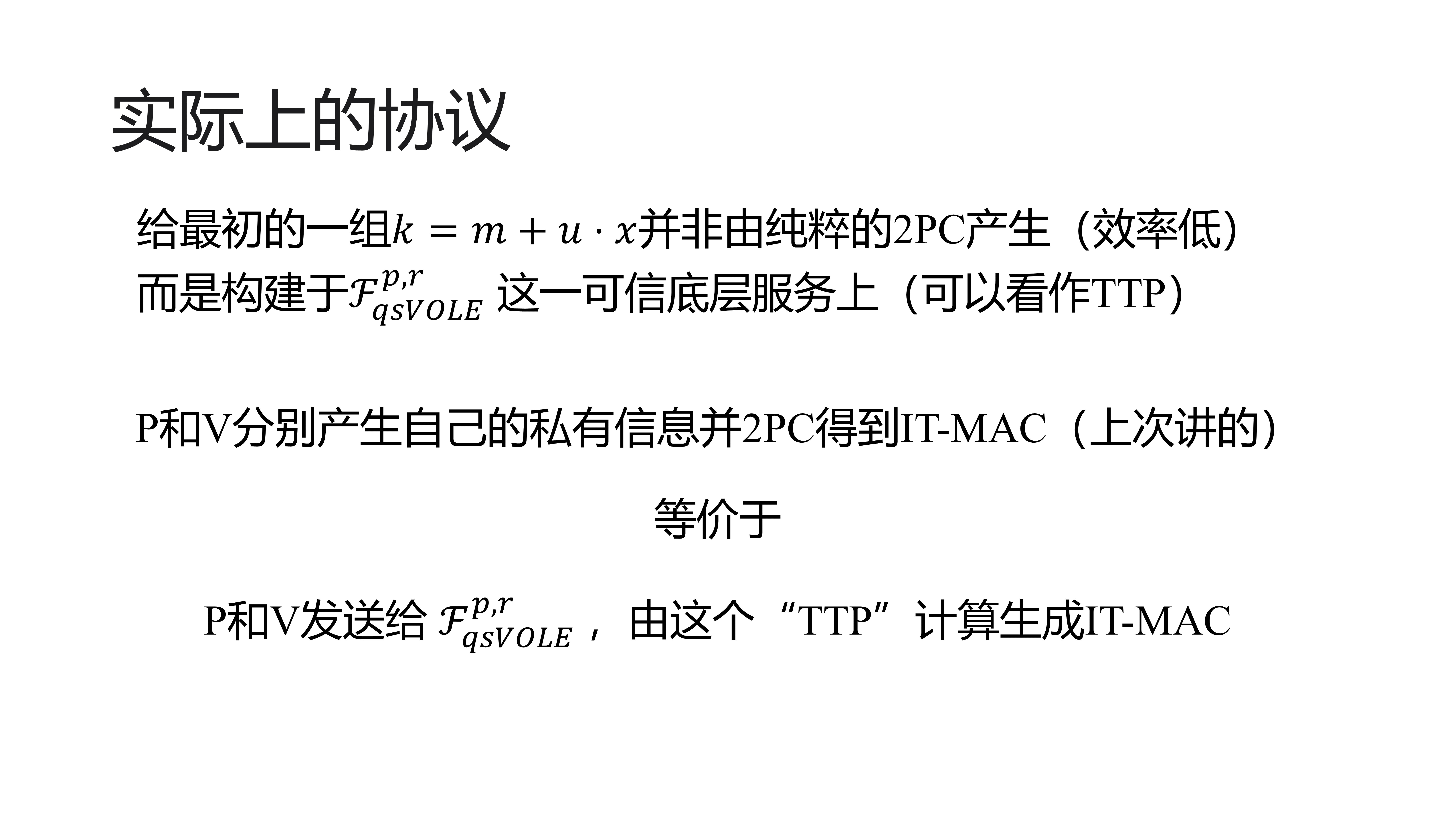 具体来说,对于 d=w−u,原方案中 u 由随机数生成器产生;若令 d 由类随机数生成器产生,则需要在在线阶段对 IT-MAC 进行额外绑定,因此整体效率不可能优于 JesseQ 论文中的方案。